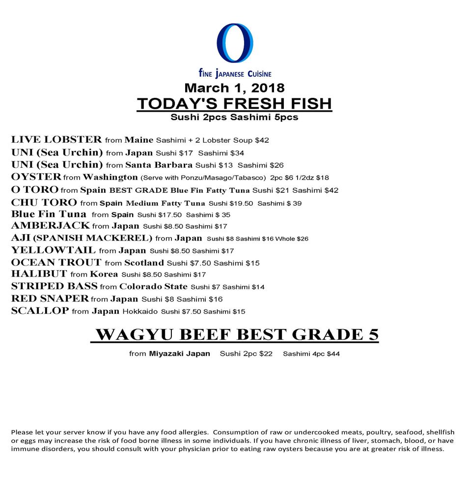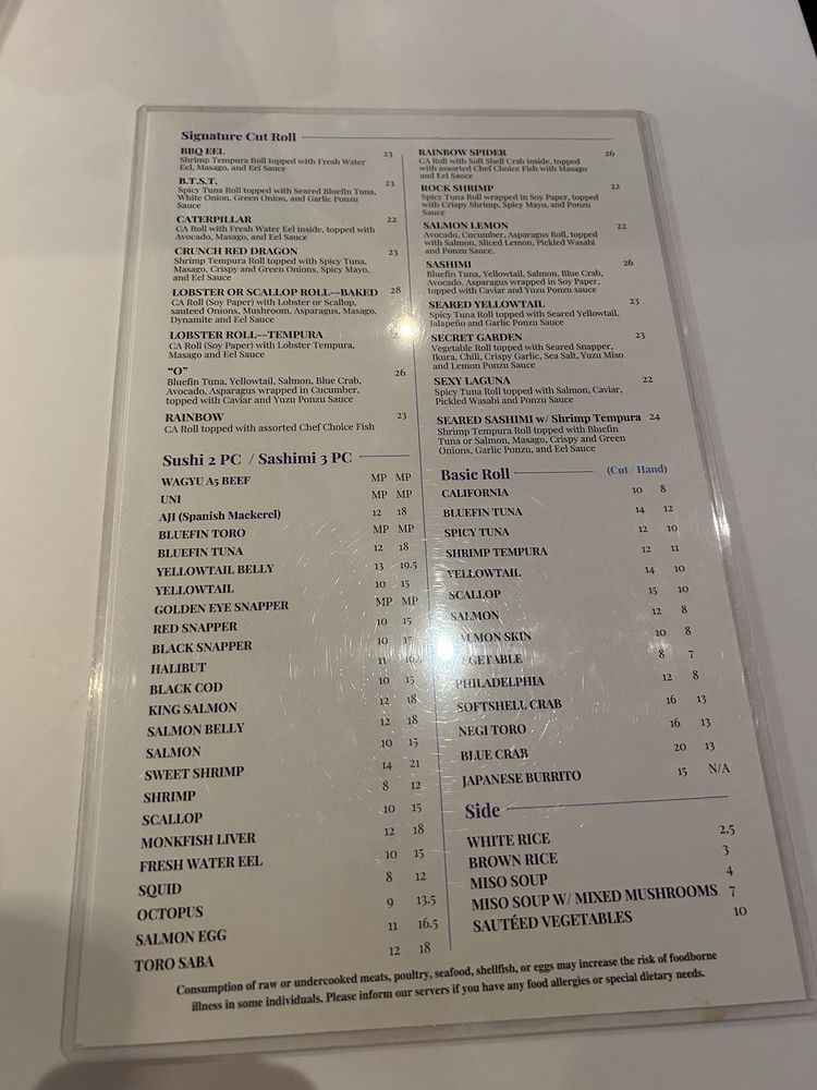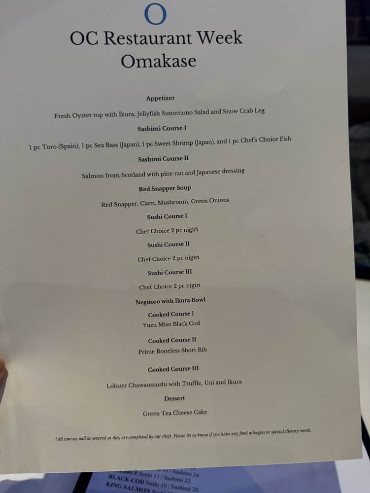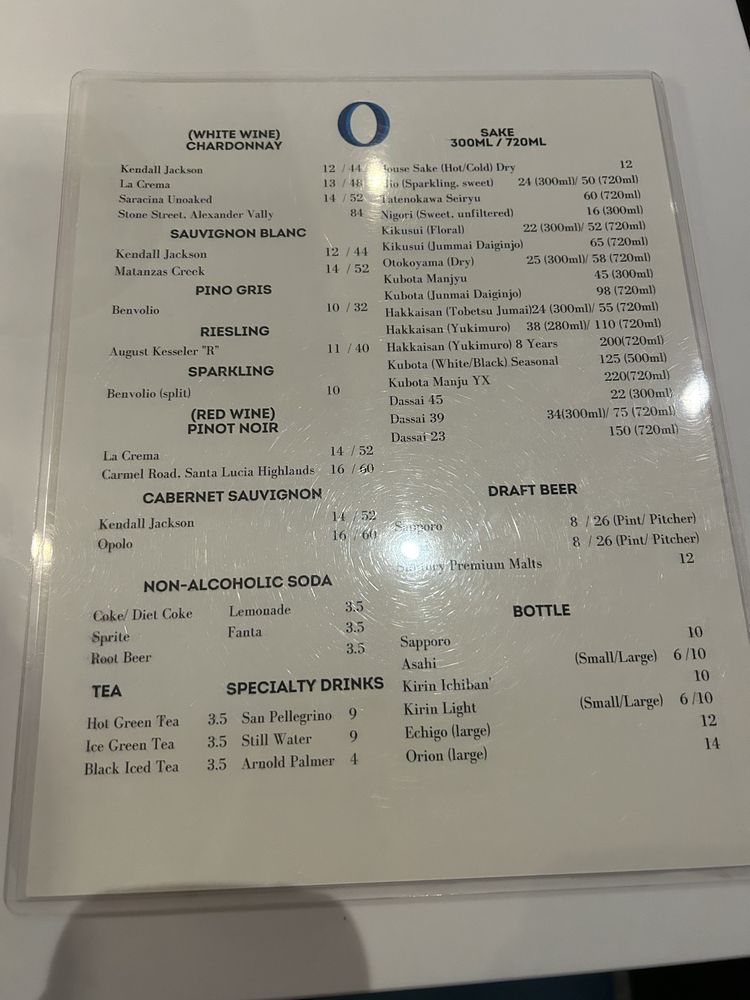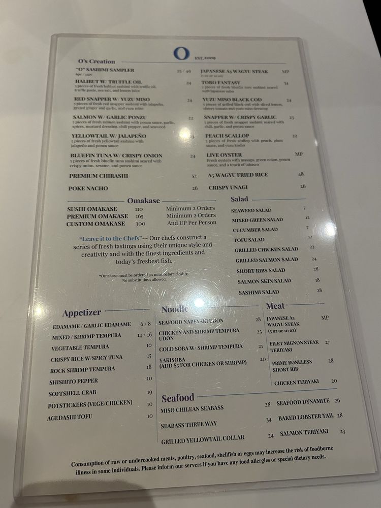 Introducing the menu at O Fine Japanese Cuisine, located in Irvine, CA, a trendy sushi bar offering a range of vegan and limited vegetarian options. With a variety of amenities like delivery, takeout, and wheelchair accessibility, this restaurant provides an exceptional dining experience. Customers praise the attentive service, knowledgeable staff, and delicious dishes, such as the premium chirashi bowl and the chef's choice sushi set. Highlights include the Goldeneye snapper sashimi and the A5 wagyu with uni, showcasing the freshness and flavorful combinations. The ambiance is elegant and business casual, perfect for special occasions or casual dining. Overall, O Fine Japanese Cuisine impresses with its top-notch food quality and attentive service, making it a must-visit for sushi lovers.
